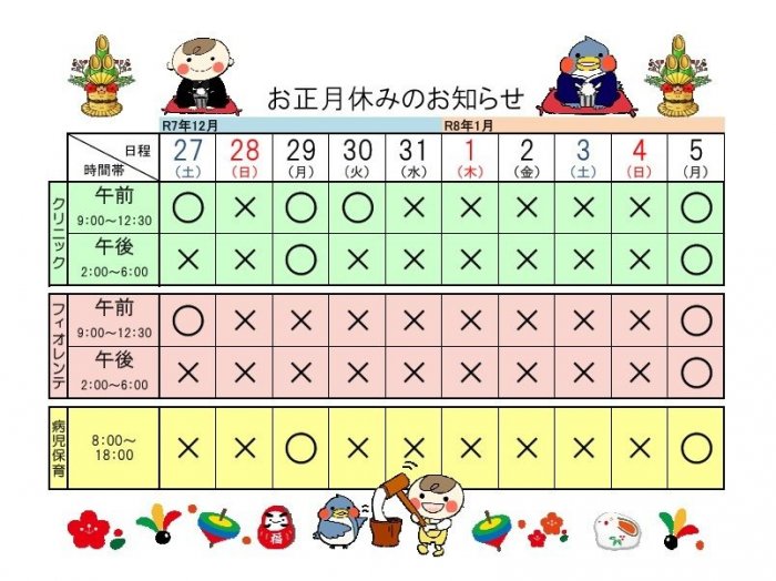 2023年12月30日(土)~2023年1月3日(水)まで、休診とさせて頂きます。